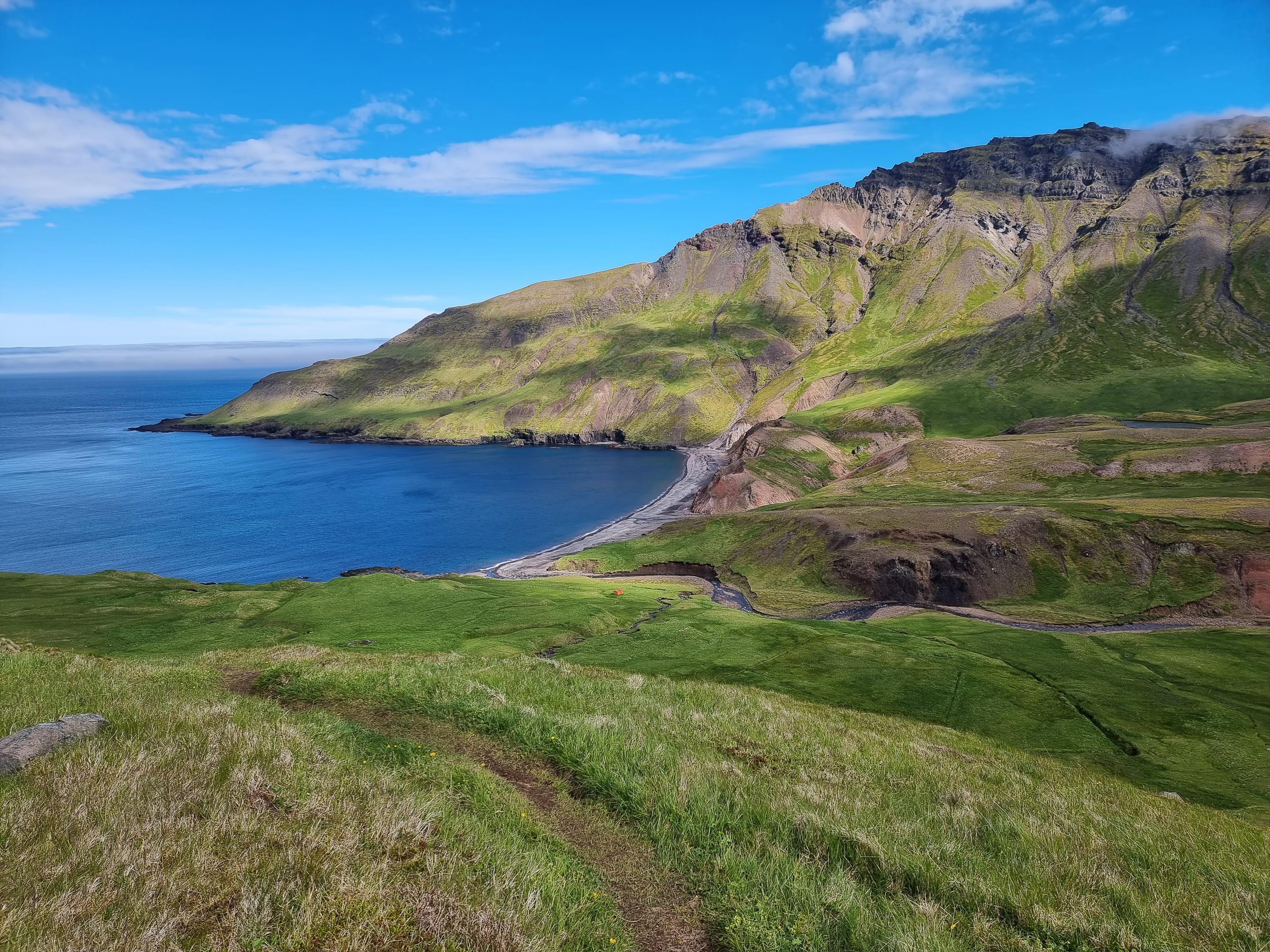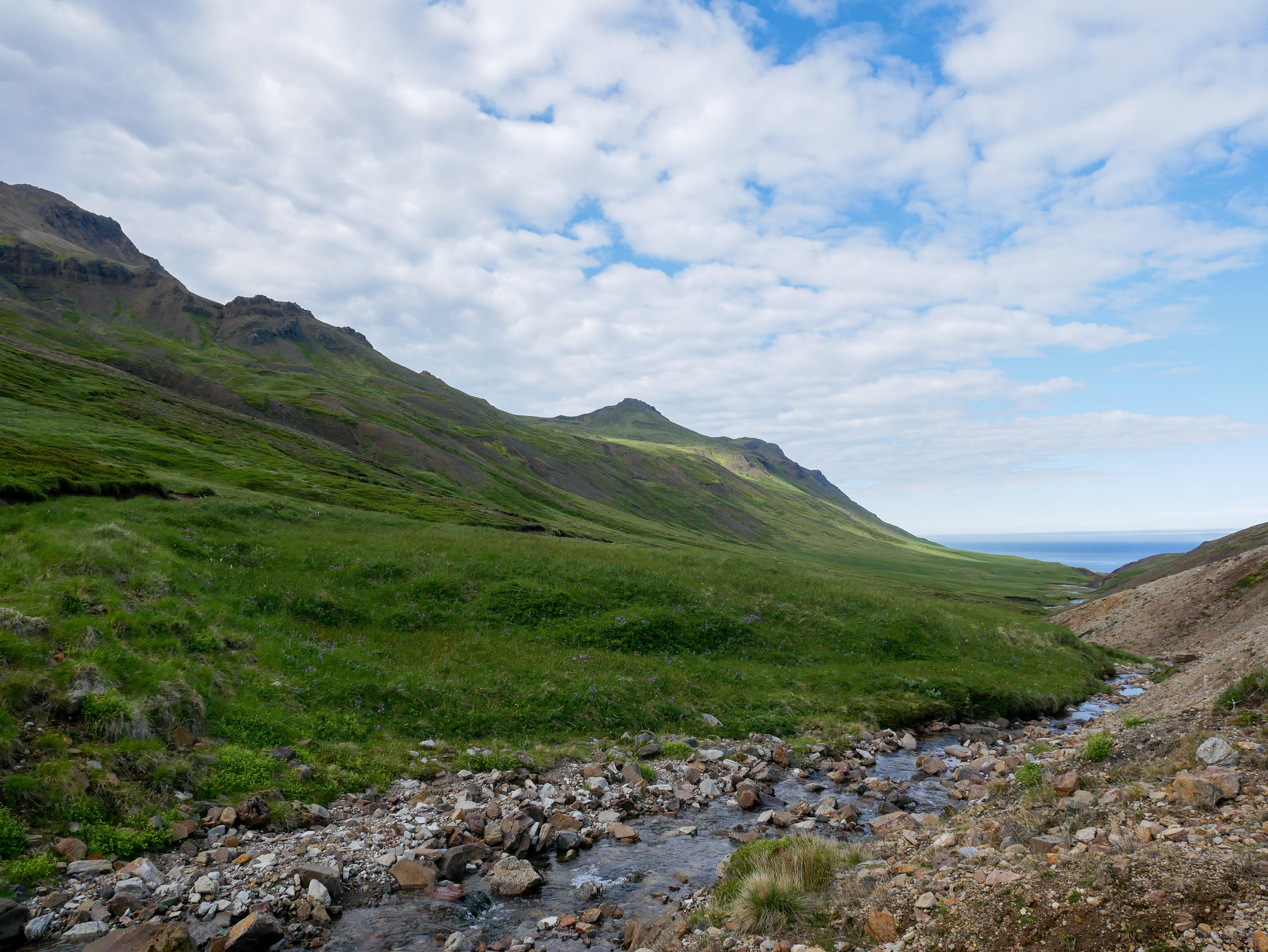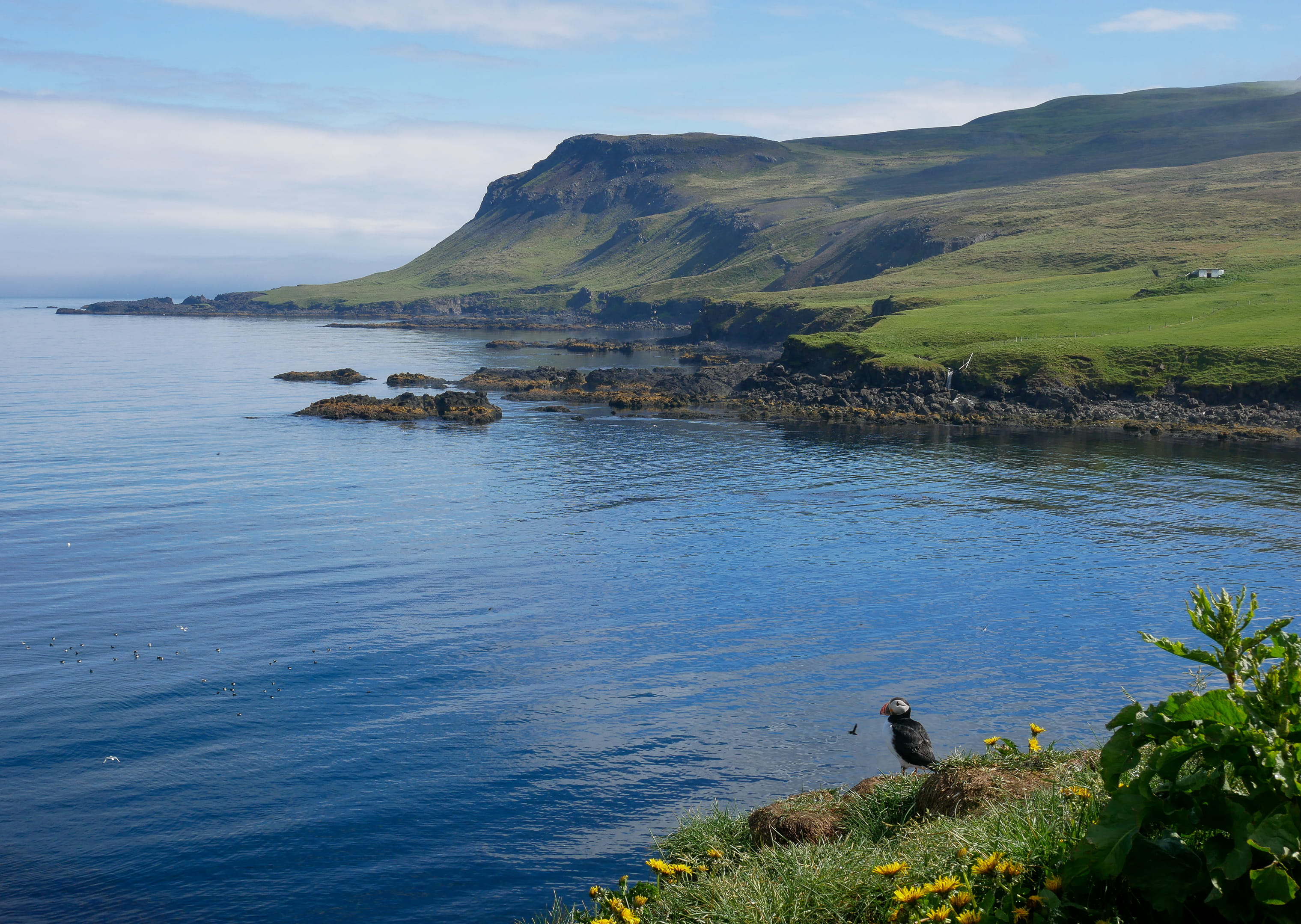 Nous démarrons la journée par la découverte d’un lieu de nidification de macareux et autres oiseaux (mouettes, guillemots et eider) au nord de Seydisfjördur. On peut approcher les oiseaux de très près notamment grâce à un poste d’observation. On passera la matinée à les observer avec une certaine fascination, ils ne cessent de faire des aller-retour entre le nid (un simple trou dans la terre) et la mer pour ramener des poissons à leurs petits. Le temps est splendide, on a eu de la chance !