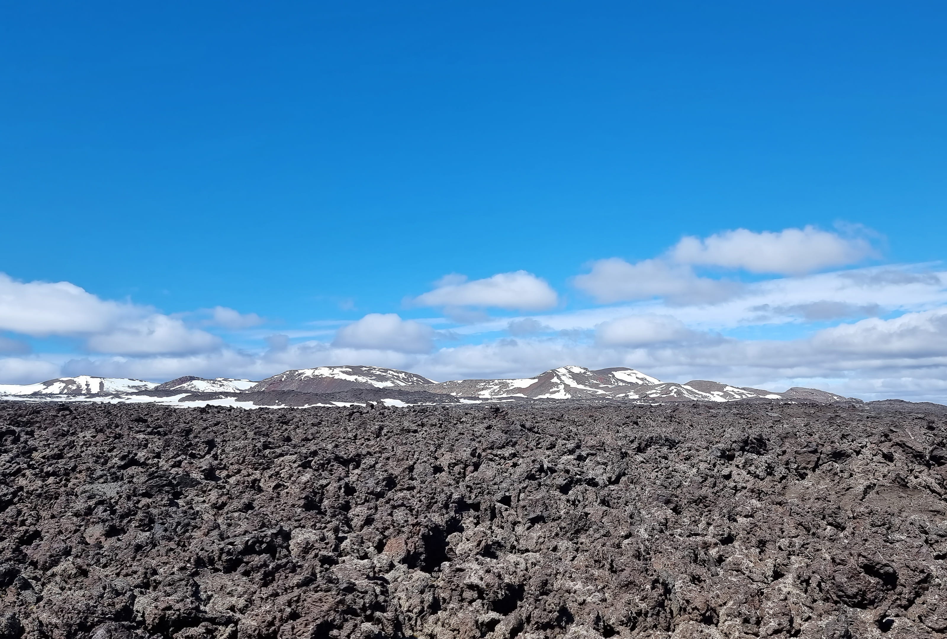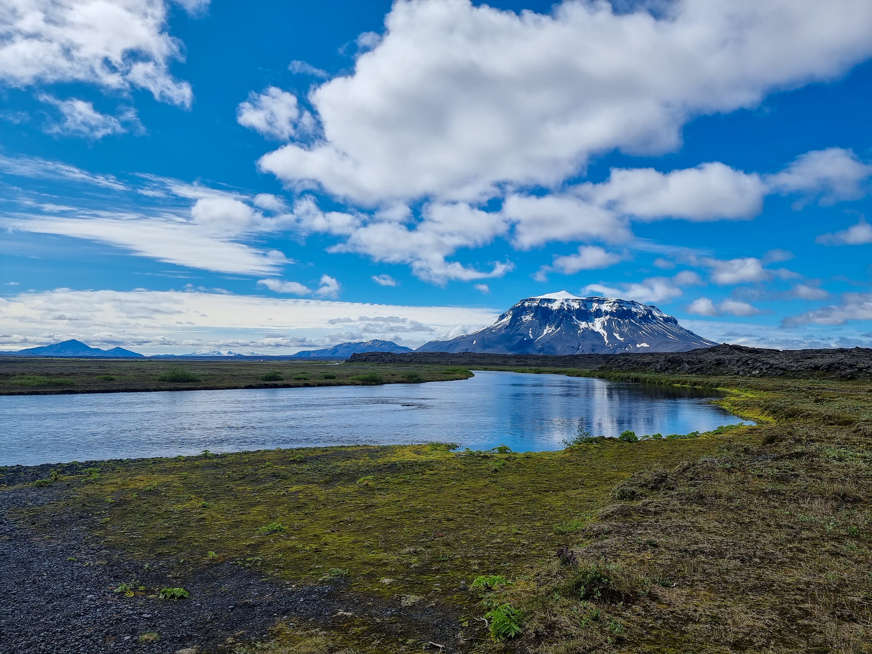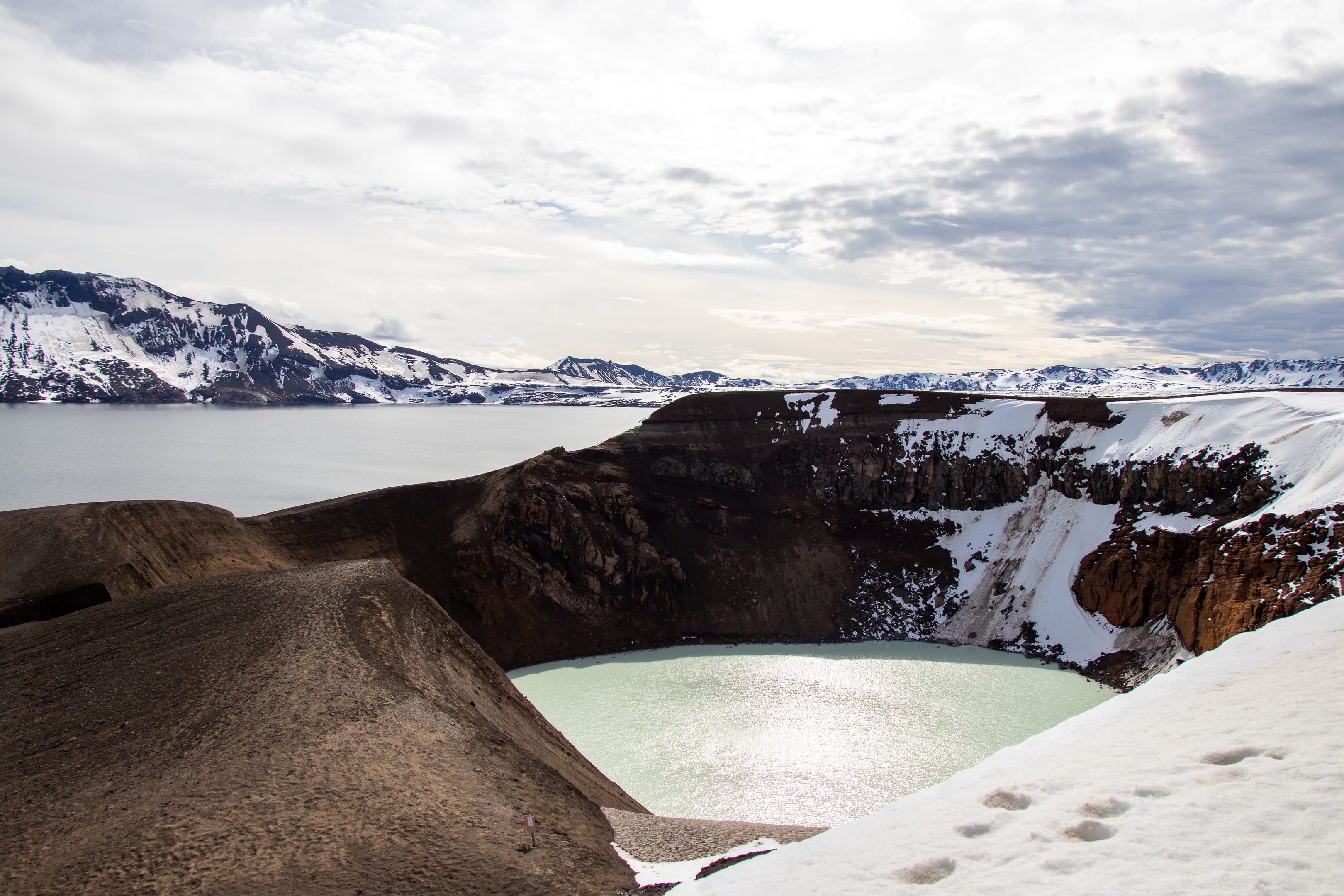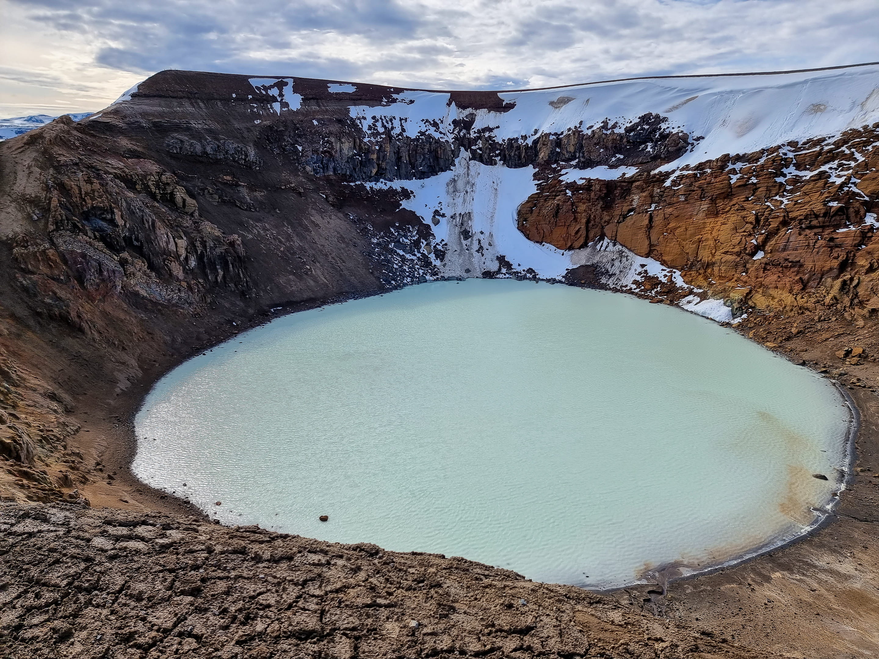 Nous arrivons au bout du chemin et apercevons le lac Öskjuvatn, profond de plus de 200 mètres l’air de rien. Juste à côté, il y a le cartère Vití, bleu turquoise pâle, ça sent un peu le souffre soyons honnête. Il est normalement possible de s’y baigner, car la température avoisine les 20°C grâce à la chaleur souterraine. Quand nous y étions, ce n’était pas autorisé par mesure de sécurité, car le volcan semble un peu plus actif depuis quelques temps.
