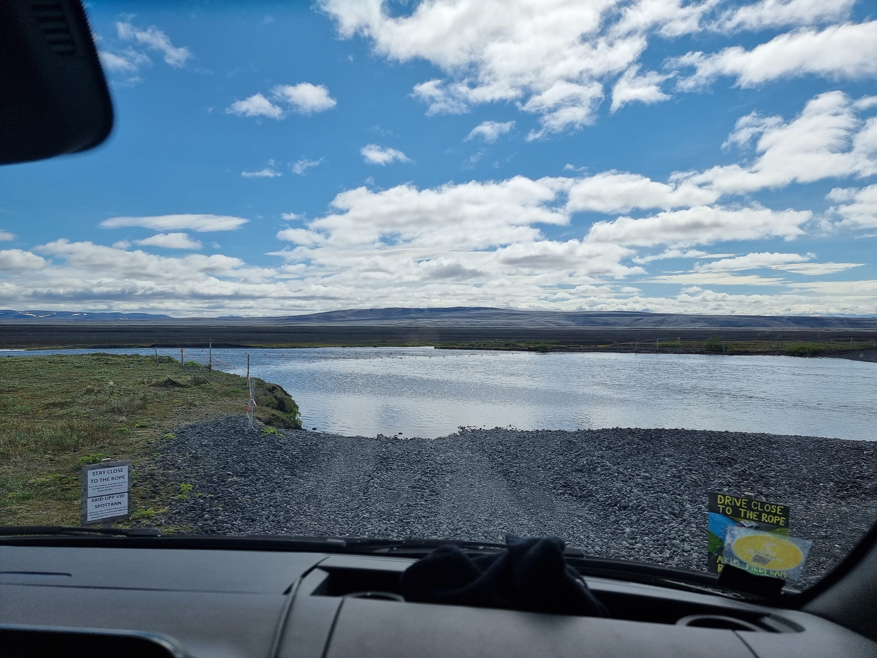 On atteint Askja en 3h par une piste (la fameuse F88) non goudronnée, mais qui roule bien dans l’ensemble. Il faut aussi franchir deux gués (heureusement peu profonds). Cette route n’est accessible qu’aux véhicules 4x4 et interdite aux véhicules de location.