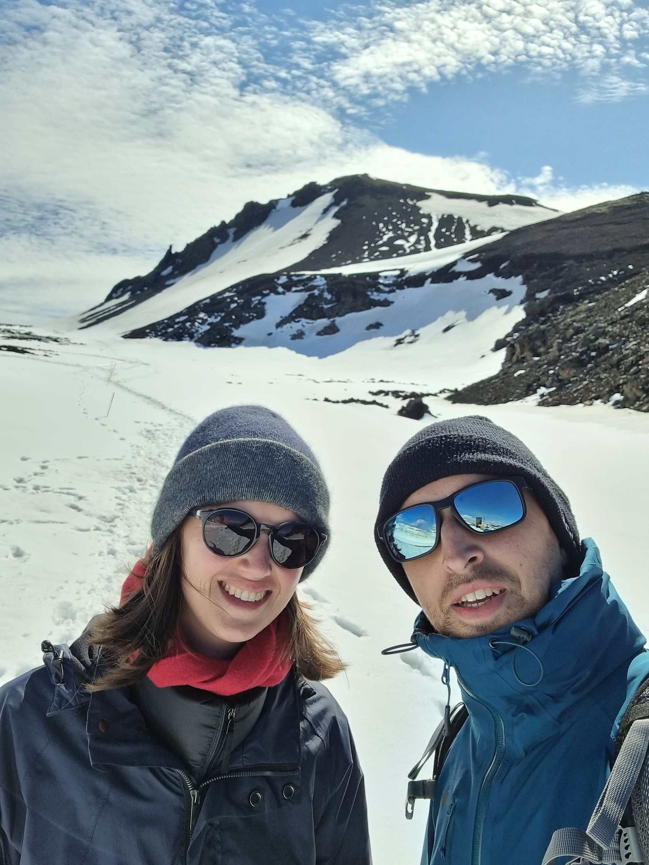 Le soleil brille, le silence règne et la neige crisse sous nos pas… et nous sommes en juillet ! Sensations incroyables et vraiment dépaysantes. Cette randonnée est tout simplement incroyable. Les photos ne sont probablement pas à la hauteur de la beauté des paysages que nous avons vus. Il fait environ 10°C, et on enlèvera rapidement nos bonnets après quelques minutes de marche dans la neige.