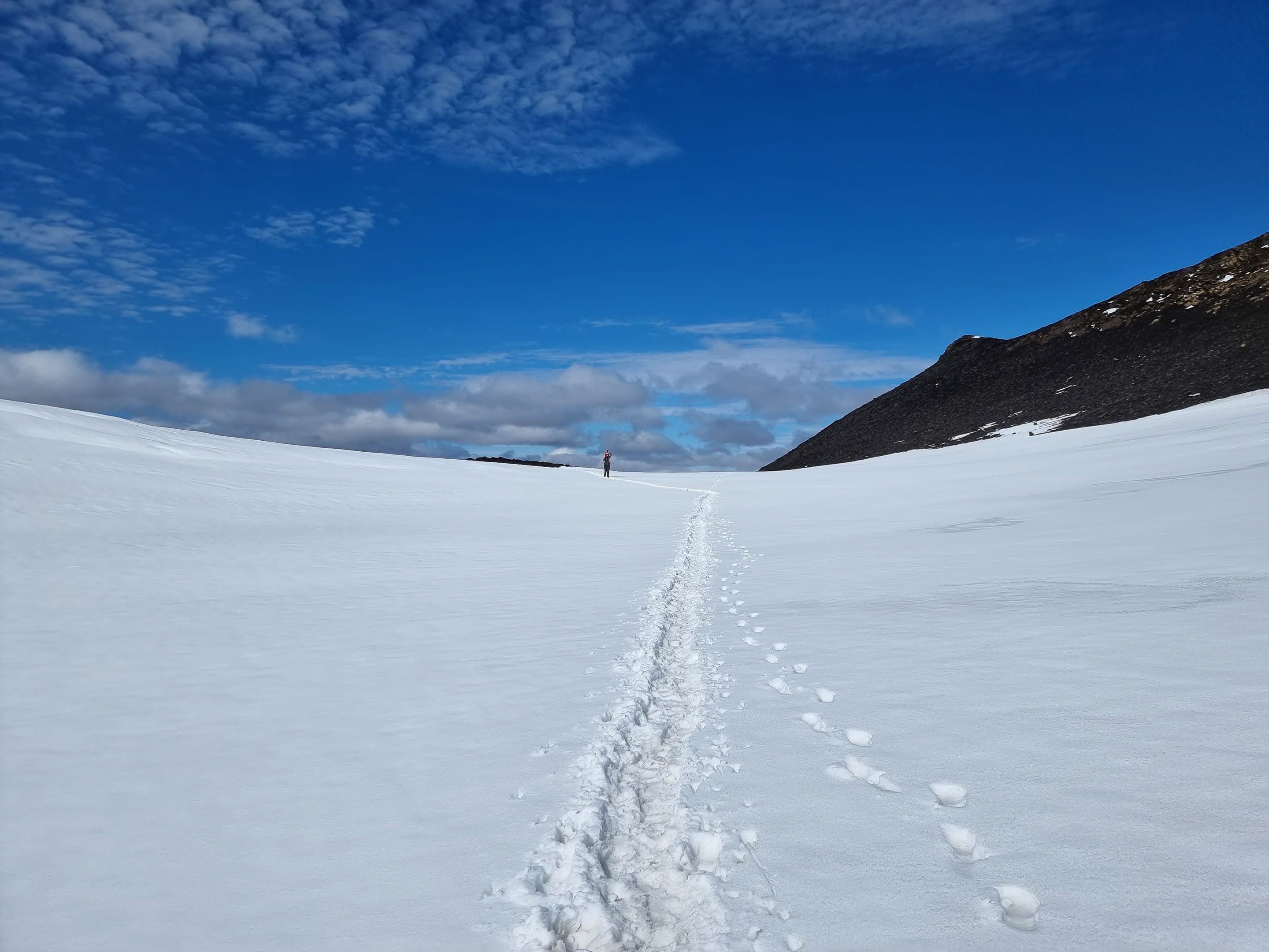 Deux jours avant notre périple à Askja, il était tombé deux mètres de neige en une nuit. L’hiver semble avoir du mal à quitter la région cette année, nous a-t-on dit. Et à notre arrivée au refuge, la neige est bien là. La neige n’est pas si fréquente en juillet. Nous faisons la randonnée de 9km (aller-retour, quasiment plat tout du long) du refuge jusqu’au cratère Vití dans la neige. Les rangers ont aménagé le chemin différemment, un peu en amont, car on ne peut pas accéder au parking habituel au début de la randonnée à cause de la neige. Tout est très bien balisé et des rangers sont là pour donner des informations.