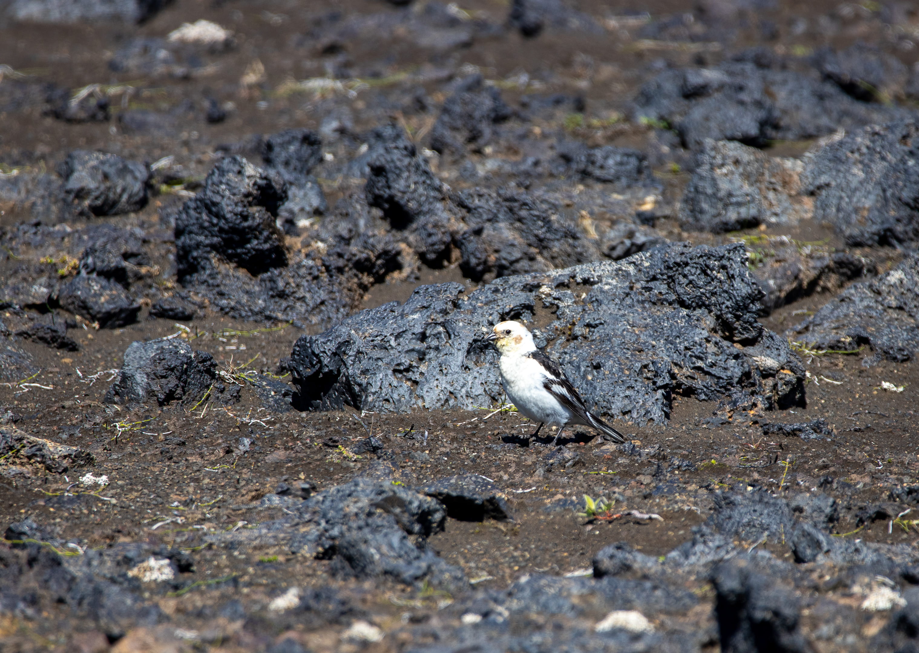 Les paysages sont très étonnants, on roule sur des champs de lave et au milieu des volcans. On a parfois l’impression d’être sur Mars. Seuls quelques toutes petites plantes et quelques petits oiseaux arrivent à vivre dans ce désert. Désert, car c’est aussi l’endroit le plus sec du pays. On a pu observer des bruants des neiges et des pluviers dorés, souvent proche d’un cours d’eau quand même.