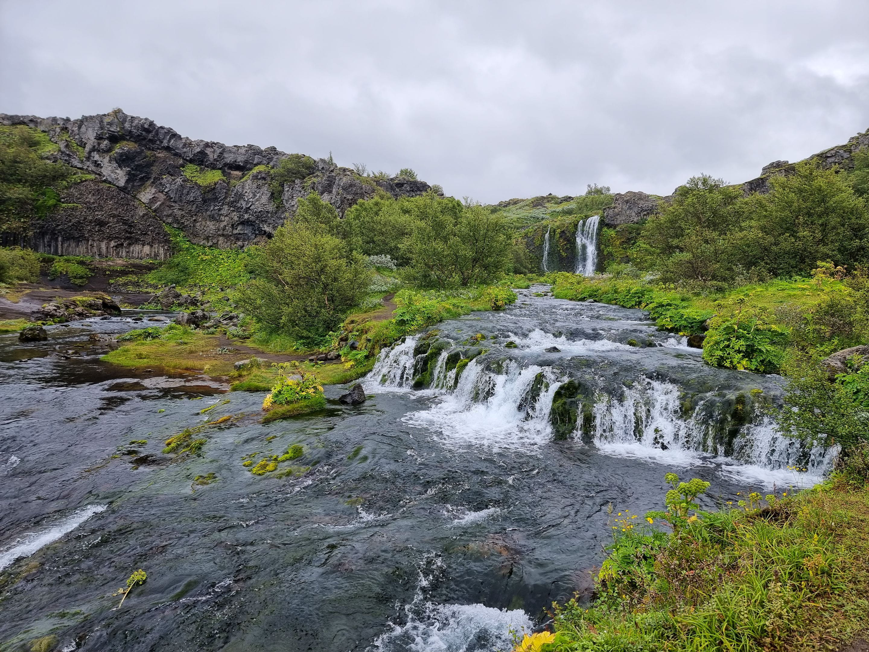 Sur le chemin, on découvre le canyon de Gjáin, jolie vallée verdoyante avec de nombreuses grottes et cascades. Un petit paradis !